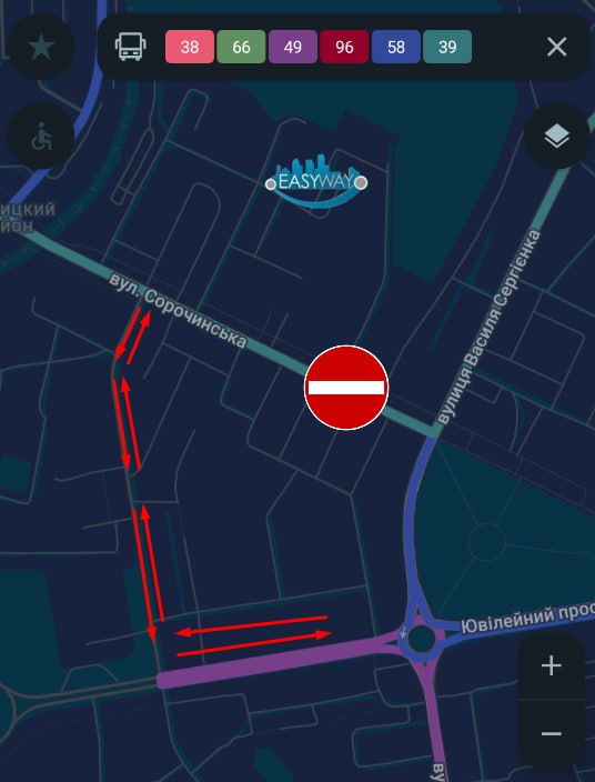 «В районі вул. Сорочинська перекрито рух транспорту. Автобуси №№ 38, 39 рухаються в об’їзд вулицею Козака Бабури».