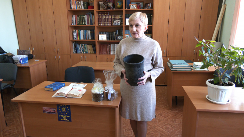 Ірина Кривко тримає велику керамічну форму, в якій пекли паски. Суспільне Запоріжжя
