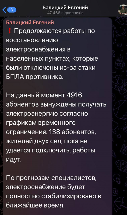 На тимчасово окупованих територіях Запорізької області продовжуються масштабні та неконтрольовані відключення електроенергії, які з кожним днем стають тривалішими. Постійні блекаути створюють серйозні труднощі для російських окупаційних військ та суттєво сповільнюють їхні наступальні дії. Про це повідомляє у Телеграм-каналі керівник ГО «Центр вивчення окупації» Петро Андрющенко.