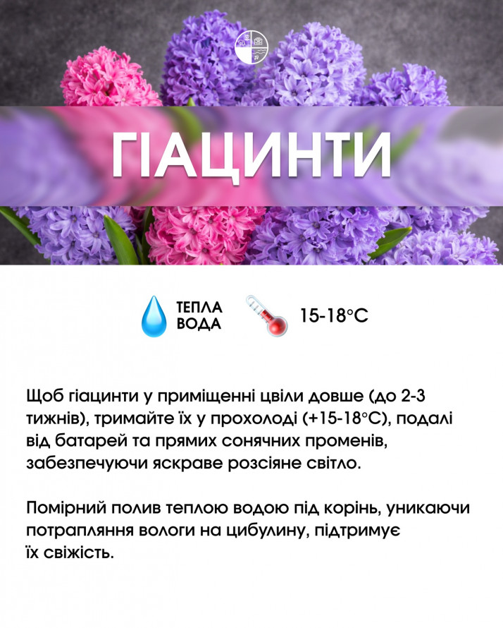 Кімнатні гіацинти люблять прохолодне світло і регулярний, але помірний полив. Щоб продовжити цвітіння, підтримуйте температуру близько 18°С і не допускайте пересихання ґрунту.
