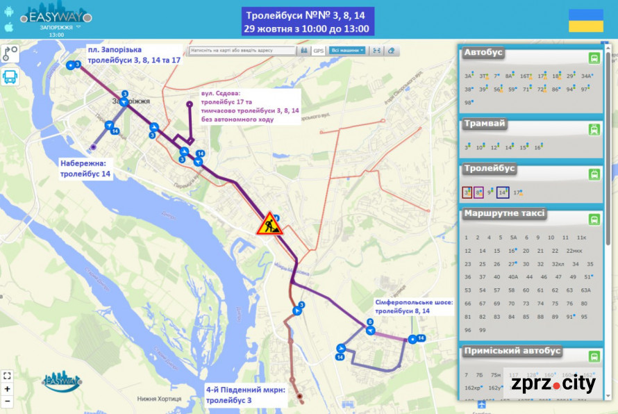 Тролейбуси не курсуватимуть частиною проспекту Соборного – від вулиці Першої Ливарної до Дніпровської.