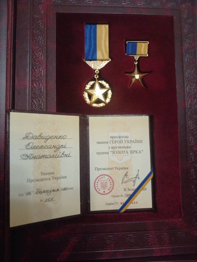«За особисту мужність і героїзм, виявлені у захисті державного суверенітету та територіальної цілісності України, самовіддане служіння українському народу присвоїти звання Герой України з врученням ордена «Золота Зірка» Давиденко Олександрі Анатоліївні — старшому солдату».