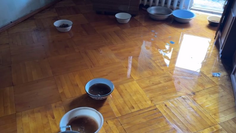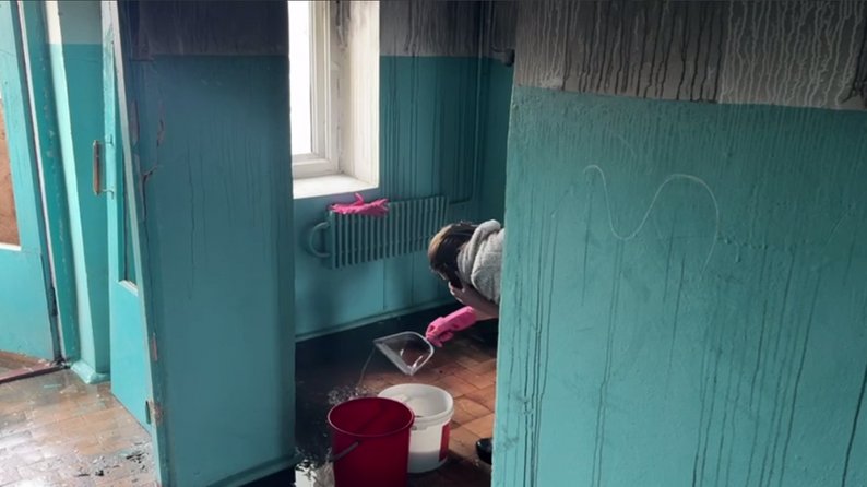 Вода після пошкодження труб внаслідок російського обстрілу в будинку, де мешкає Юрій. Запоріжжя, 24 березня 2026 року. Суспільне Запоріжжя/Поліна Мороз