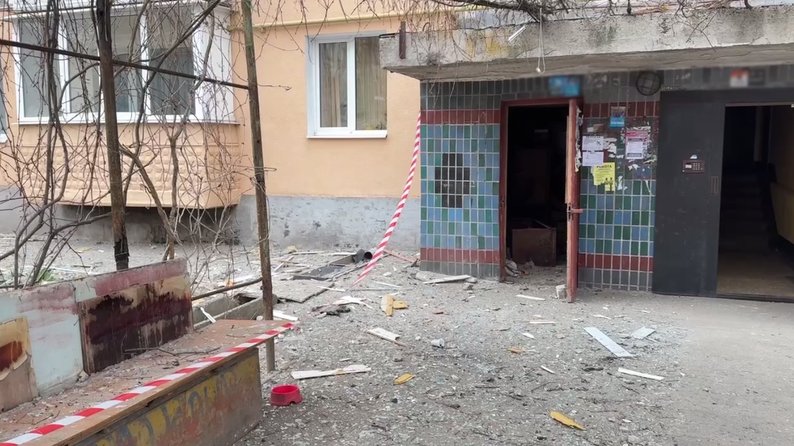 Уламки обшивки та особистих речей біля під’їзду пошкодженої багатоповерхівки у Запоріжжі, 24 березня 2026 року. Суспільне Запоріжжя/Поліна Мороз