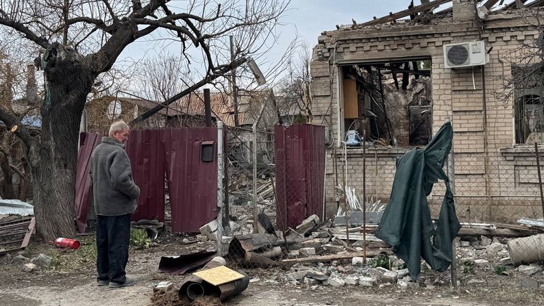 Житель запоріжжя Віталій стоїть біля свого напівзруйнованого будинку. Запоріжжя, 24 березня 2026 року. Суспільне Запоріжжя/Дар’я Пасічник