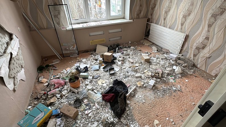 Уламки цегли та скла в одній із пошкоджених кімнат у квартирі Тетяни. Запоріжжя, 24 березня 2026 року. Суспільне Запоріжжя/Карина Галунова