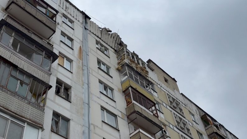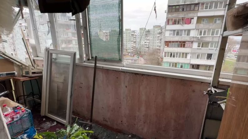 На третьому поверсі пошкодженої багатоповерхівки мешкає Андрій — у його квартирі понівечені балкон та вікна: