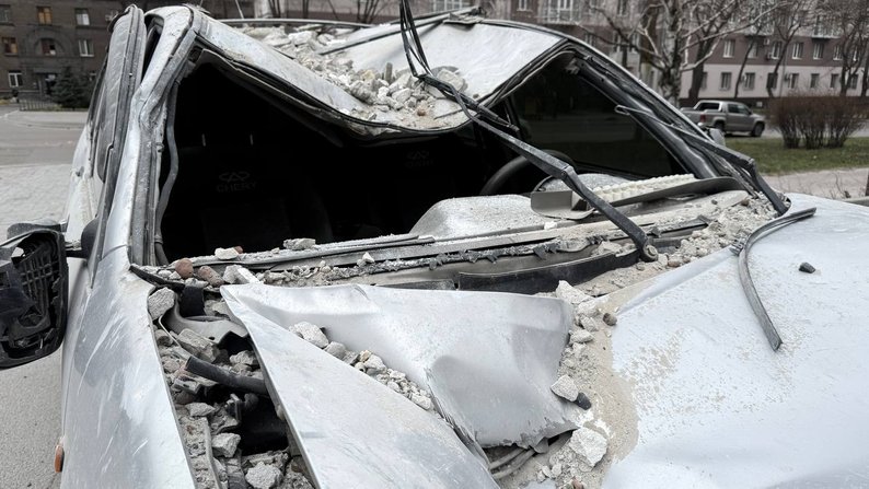 Пошкоджена автівка поблизу понівеченої багатоповерхівки. Наслідки російської комбінованої атаки на Запоріжжя, 24 березня 2026 року. Суспільне Запоріжжя/Альона Наталуха