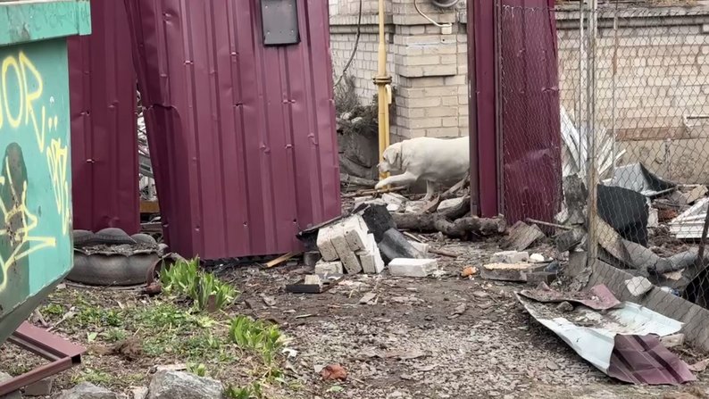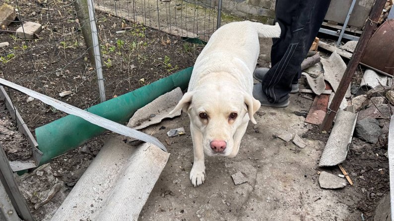 Лабрадор серед уламків пошкодженого будинку в Запоріжжі, 24 березня 2026 року. Суспільне Запоріжжя/Дар’я Пасічник