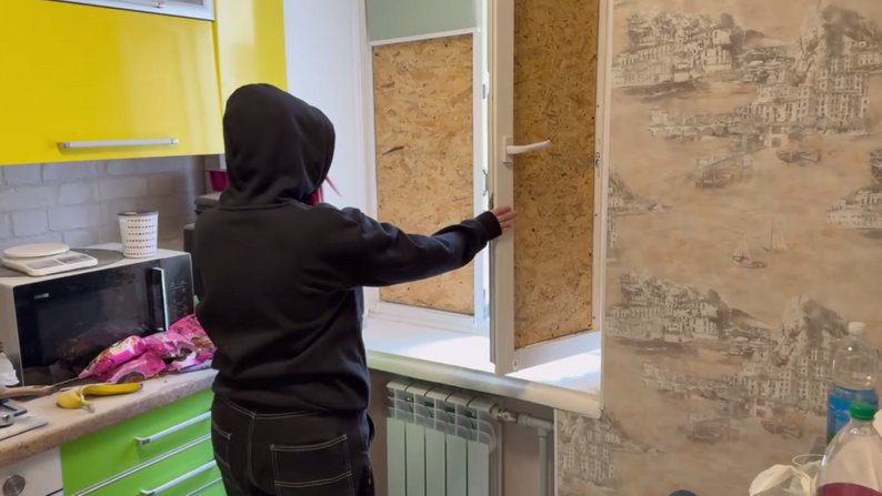 Жителька Запоріжжя відкриває вибиті обстрілом шибки. Запоріжжя, 24 березня 2026 року. Суспільне Запоріжжя/Олена Лисенко