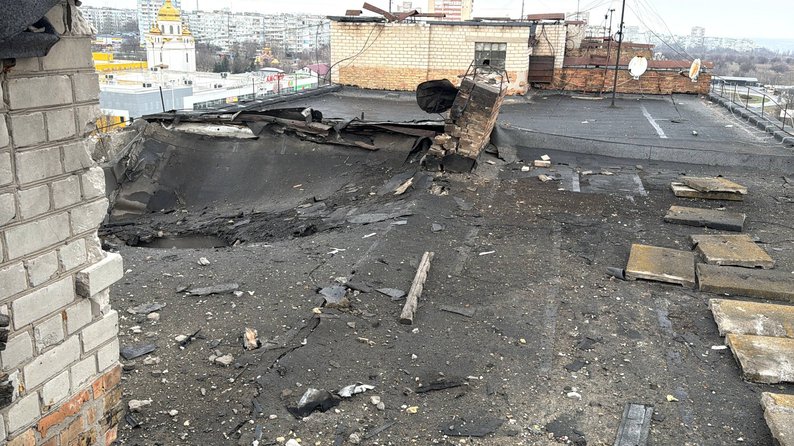 Пошкоджена покрівля у багатоповерховому будинку в Запоріжжі, 24 березня 2026 року. Суспільне Запоріжжя/Карина Галунова