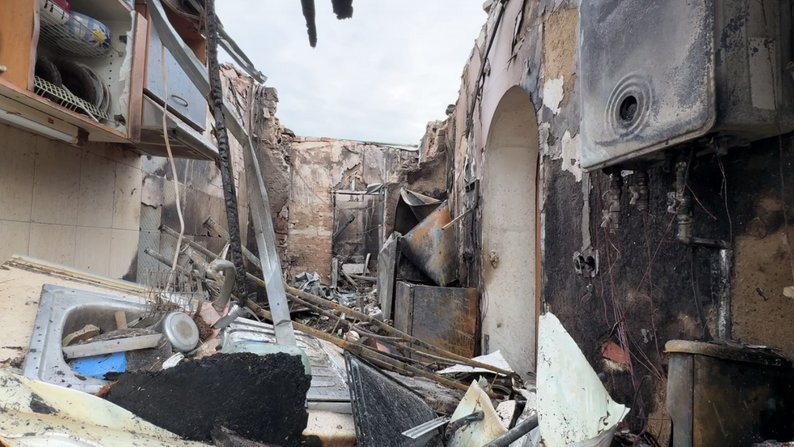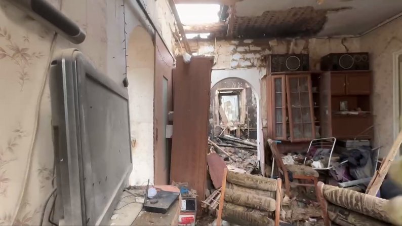 "Шум двигуна, летить "шахед", а потім різко пікірує і звук "бах". Стеля падає на нас з дружиною, ми якраз спали о другій ночі, вилізти звідси вже не змогли. Тут вже все горіло. Вилазили через останнє вікно, нам хлопці допомагали. Он у мене вогнегасник стоїть, але його вистачило на три хвилини, і дивимося, що починає все горіти-горіти, стеля руйнуватися місцями. Воно диму скільки! Все, що встигли схопити, що під рукою: телефон, документи та обручки на полиці лежали присипані".