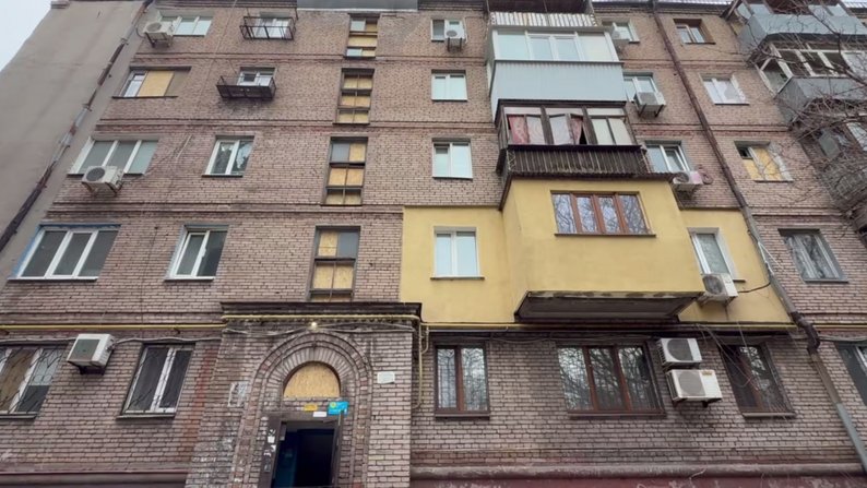 В одній із квартир, пошкоджених російською атакою, вибиті вікна. Її мешканка відпочивала вночі, коли стався обстріл: