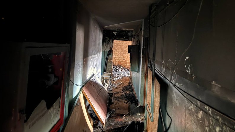 Згорівший восьмий поверх, де загинув 32-річний чоловік внаслідок російського обстрілу. Запоріжжя, 24 березня 2026 року. Суспільне Запоріжжя/Поліна Мороз