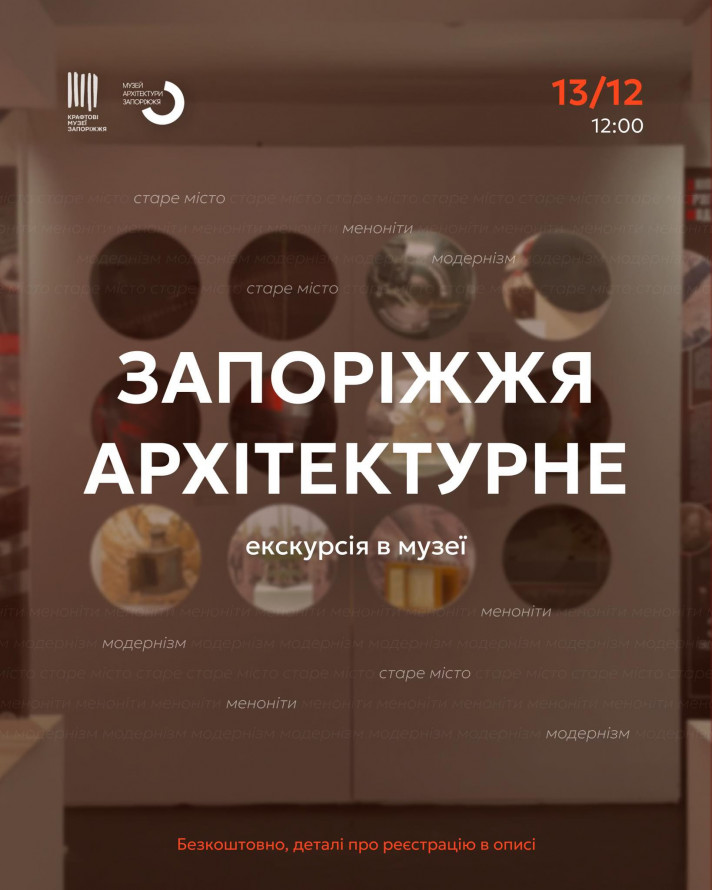 — 13 грудня о 12:00 — екскурсія «Запоріжжя архітектурне» у Музеї архітектури Запоріжжя. Безкоштовно, за попередньою реєстрацію (як зареєструватись читайте нижче)..