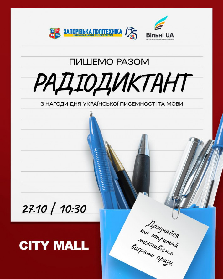 «У цей день диктант напишуть студенти та викладачі Національного університету «Запорізька політехніка», співробітники ТРК CITY MALL — тож долучайтеся і ви!» — повідомили на сторінці ТРК у фейсбуці.