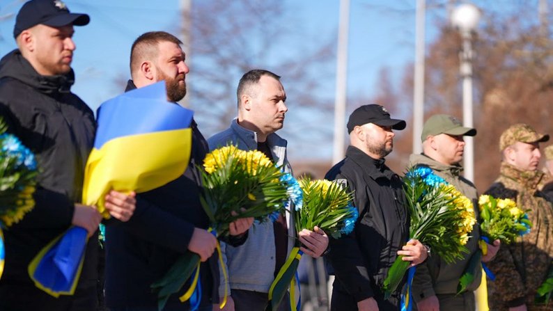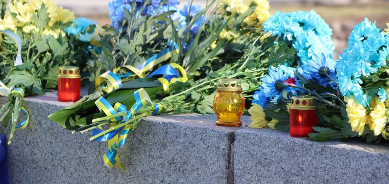 Присутні вшанували памʼять полеглих українських добровольців хвилиною мовчання та поклали до меморіалу синьо-жовті квіти.