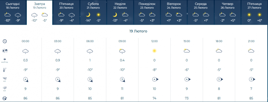 — Четверг 19 лютого — вночі за прогнозом буде хмарно, дощ та мокрий сніг. Температура: +1°…-1°C. Вітер: Північно-Західний 7-12 м/с
