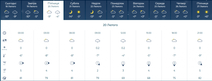 — П’ятниця 20 лютого — вночі хмарно, без опадів. Температура: -2°…-4°C. Вітер: Південний 3-8 м/с.