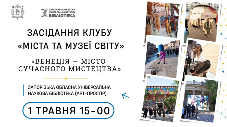 — 1 травня о 15.00 — засідання клубу «Міста та музеї світу», тема: «Венеція — місто сучасного мистецтва». 9 травня відкривається Венеційська бієнале — головна у світі міжнародна виставка сучасного мистецтва, яку порівнюють по значимості з Олімпіадою та Євробаченням.