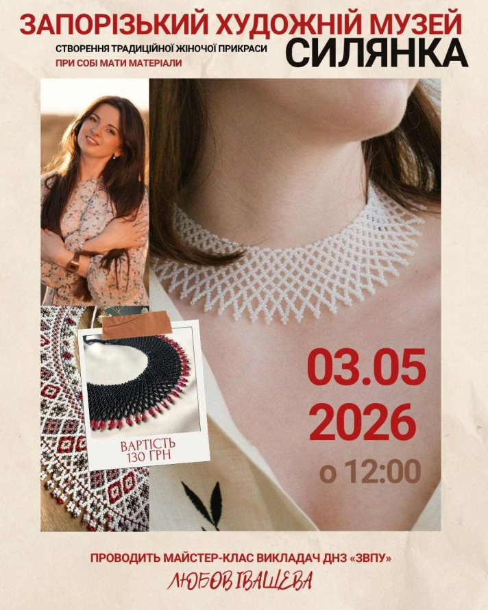 — 3 квітня о 12.00 — майстер-клас зі створення прикраси з бісеру. При собі треба мати матеріали: чеський бісер Preciosa №10 або №11 довільного кольору (близько 100г); мононитку білого кольору для бісеру; тонку голку для бісеру №11-12; ножиці — маленькі, але гострі для обрізання ниток; нитки муліне під колір бісеру (2 мотки).