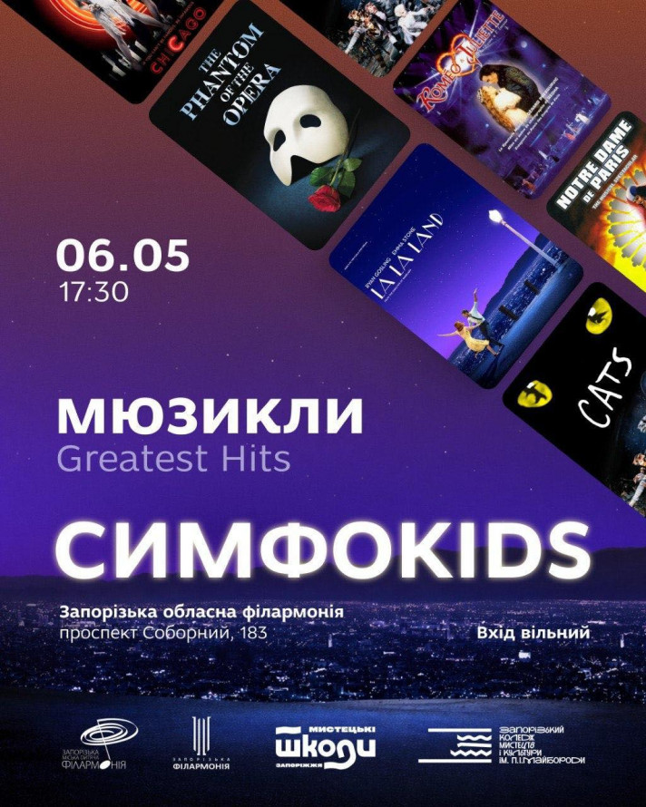 — 6 травня о 17.30 — концерт «Мюзикли: Greatest Hits» дитячого симфонічного оркестру «СимфоKIDS» під керівництвом диригента Дмитра Мітніка. На сцені Запорізької обласної філармонії. Вхід тільки на цей концерт безкоштовний.