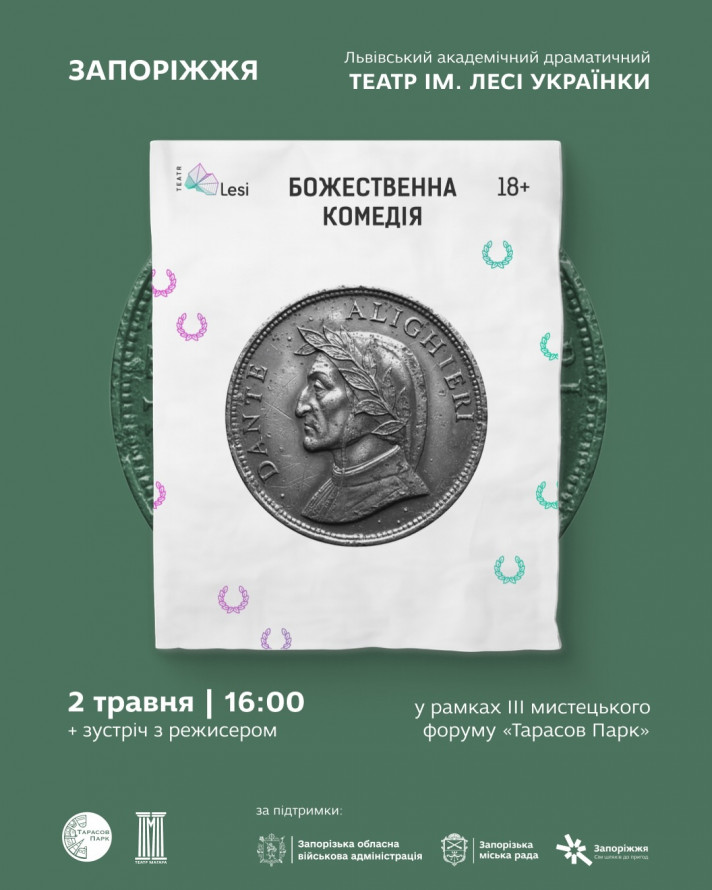— 2 травня о 16.00 — вистава «Божественна комедія» Львівського театру імені Лесі Українки, 0 18.30 — зустріч із постановником вистави, головним режисером цього театру Дмитром Захоженком.
