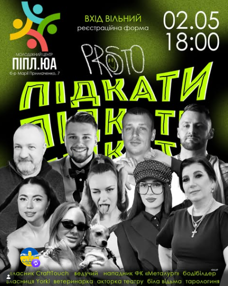 — 2 травня о 18.00 — «Підкати». Підкатувати будуть резиденти простору подій «PROSTO” та подруга простору, актриса Дому актора Анастасія Гусліста-Полозун.