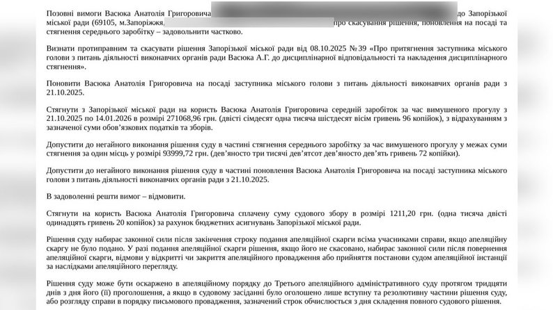 Рішення Запорізького окружного адміністративного суду щодо поновлення Анатолія Васюка на посаді. Facebook/ Анатолій Васюк