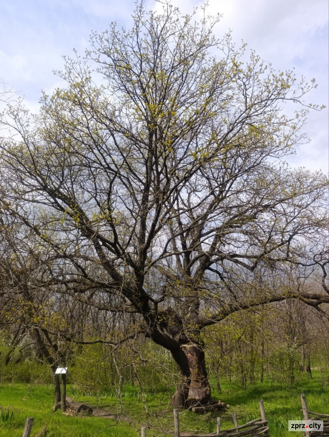 Трохи історії. На сайті Національного заповідника «Хортиця» розповіли, що ще в 2005 році, коли дерево гинуло від людської недбалості, співробітникам цього заповідника довелося залити велике дупло-згарище у стовбурі бетоном, пофарбованим у червоний колір.