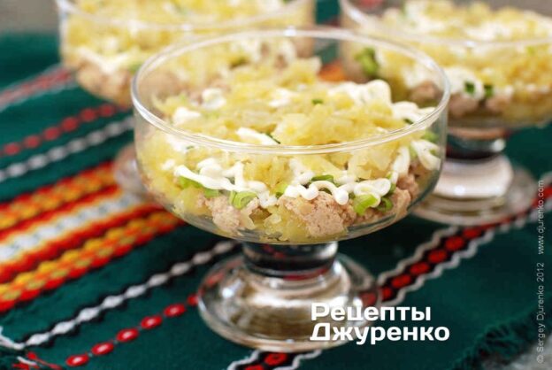 Помазати майонезом. Майонез можна приготувати самостійно, це нескладно. Перекласти готовий майонез в невеликий поліетиленовий мішечок. Відірвати в мішечку краєчок куточка, щоб вийшла маленька дірочка, і вичавлювати майонез. Так його легше розподілити по поверхні салату.