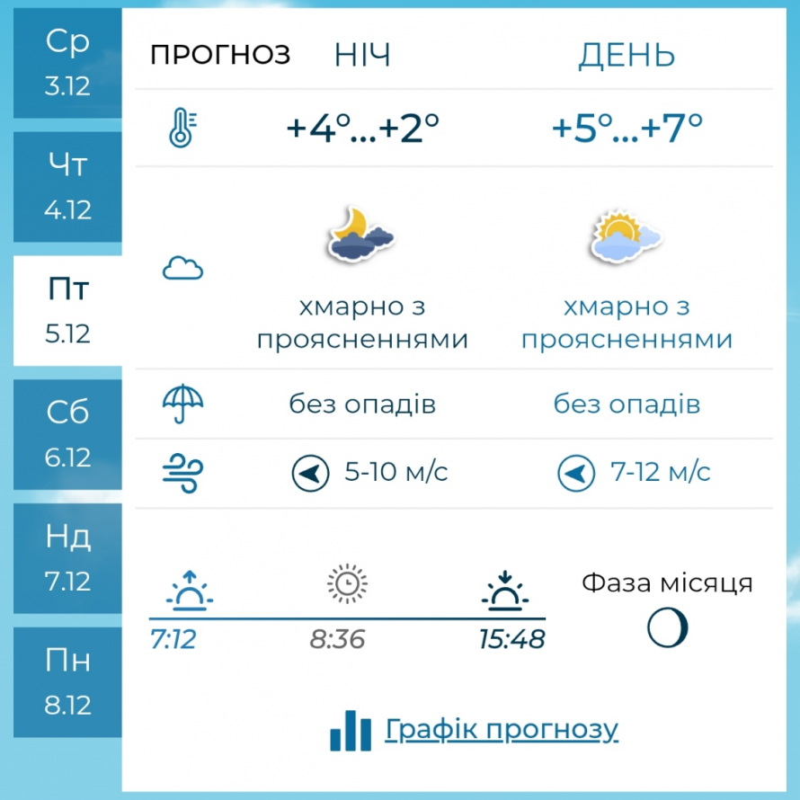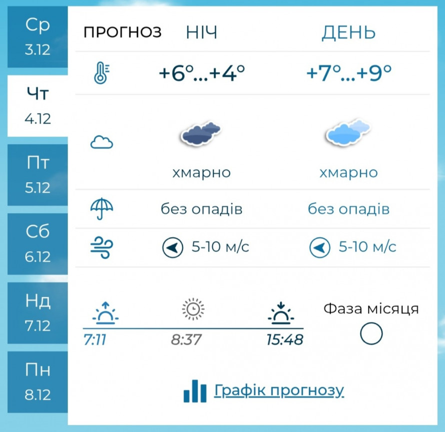 У четвер, 4 грудня, запоріжці прокинуться за хмарного неба. Нічна температура коливатиметься в межах +4…+6°C, що цілком комфортно для початку зими. Східний вітер дутиме зі швидкістю 5-10 м/с, створюючи відчуття прохолоди, але не більше.
