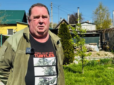 Віктор Растворов та Бодя. Суспільне Запоріжжя"Ми швидко з ним якось здружилися, що я навіть, якщо іду в магазин, виходжу з дому, то він починає лаяти, мене не пускає, бо не хоче залишатися сам. Собака наляканий. Буває ж, б'ють "шахеди", наше ППО працює — він ховається. Там є будка, прям у будку залазить. Коли стріляють, він лякається".