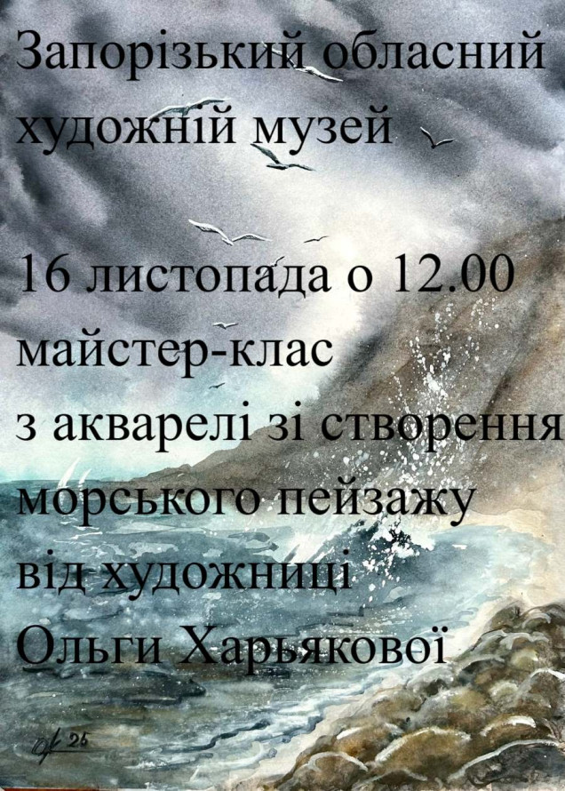 — 16 листопада о 12.00 — майстер-клас з акварелі «Морський пейзаж» від художниці, заступниці голови Запорізького міського об’єднання художників «Колорит» Ольги Харьякової. Музей надає матеріали, але можна взяти з собою свої улюблені пензлики та фарби.