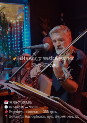 — 14 листопада о 18.00 — авторській вечір «Назад у часі: музика 60-х–90-х» Валерія Степанова (скрипка & вокал).
