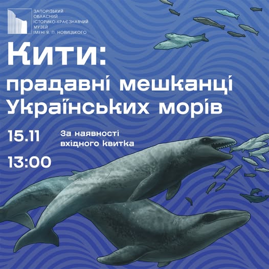 15 листопада о 13.00 — лекція «Кити: прадавні мешканці українських морів». Для відвідування лекції необхідно тільки придбати вхідний квиток у музей. Квиток — 50 грн, пільговий — 25 грн.