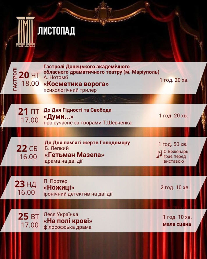 — 20 листопада о 18.00 — прем’єра психологічного трилеру «Косметика ворога» за твором сучасної письменниці Амелі Нотомб від Донецького обласного драматичного театру (Маріуполь).