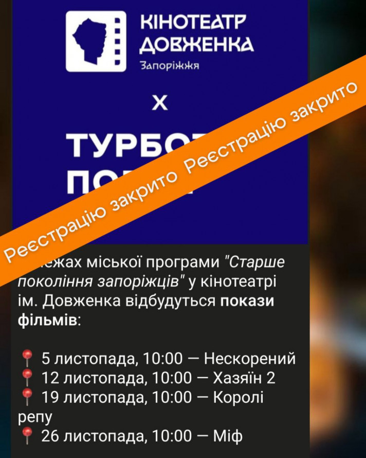 «Турбота поруч» — щосереди о 10.00 у кінотеатрі імені Довженка проходять безплатні покази українського кіно для людей 60+ в рамках міської програми «Старше покоління запоріжців».