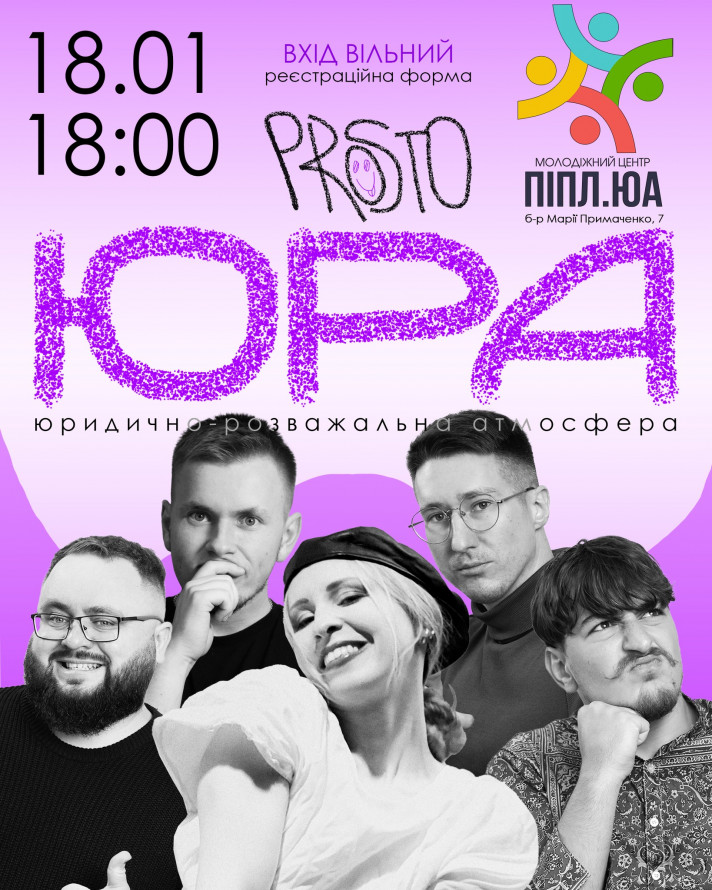 — 18 січня о 18.00 — стендап «ЮРА: Юридично. Розважально. Атмосферно» від коміків Простору подій ”PROSTO”, у молодіжному просторі «Піпл. юа».
