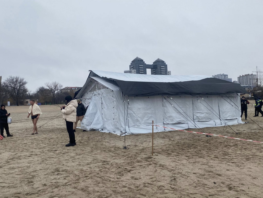 Температура води у річці Дніпро становить близько 3 градусів тепла. Щоб люди могли зігрітися після купання та безпечно переодягнутися, просто біля води рятувальники розгорнули спеціальні намети.