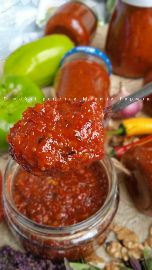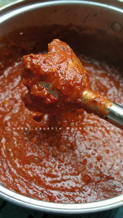 «Це ще одна новинка сезону 2025, мій авторський рецепт соусу до м’яса. Захотілося спробувати приготувати та розробити щось смачненьке та цікаве до смаженого чи запеченого м’яса. Особливо він підходить до курятини. Яскравий, густий, ароматний. Перша нотка пряна яка поступово відкриває сам смак соусу, далі плавно переходить в гостроту яка подовжує наповнювати тіло теплом. Одразу гострота не зникає, вона лагідно тримається всередині», — розповіла про цей рецепт Марина Гармаш.