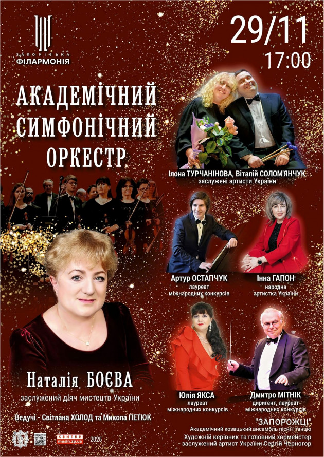 «На вас чекає вечір музики, де прозвучать твори, присвячені друзям-музикантам — талановитим солістам і колективам. Не пропустіть нагоду почути яскраву й натхненну творчість Наталії Боєвої — символ незламного духу Запорізького краю», — зазначили у філармонії.