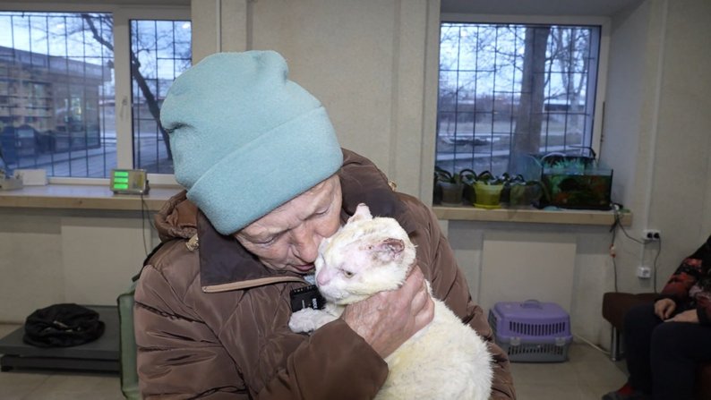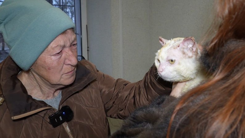Валентина Турчиненко передає Бусю подрузі. Суспільне Запоріжжя"Туди просто прикро брати. Як тільки ми там трошки підбудуємо, щоб можна було вдома самим бути, і тоді ми його заберемо туди. Я ще довго плакати буду. Він в такому страшному стані був…".
