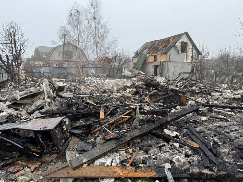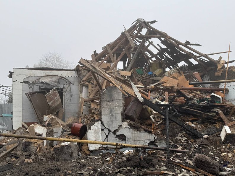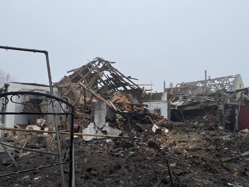 Місце російського обстрілу у Вільнянську Запорізької області, 29 січня 2026 року. Суспільне Запоріжжя"З 1965 року тут жила, і ось на старості, у 80 років, залишилася я бездомною. “Шахед” впав на газову трубу, її пошкодило, з неї йшов вогонь і перекинувся на хату. Ми знаходилися з сином вдома. Він в одній кімнаті був, я — в іншій. Він чує, що “шахед” летить. І в цей момент з обох боків, він бачить: моє вікно — скло летить, а я бачу його вікно. Даху повністю немає".