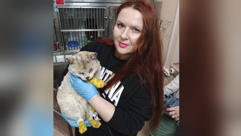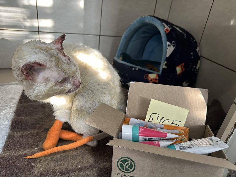 Інна Позднякова, волонтерка, голова громадської організації «Запорізька зоозахисна ліга». Суспільне Запоріжжя"Лікарі надіслали мені світлини. Він мав дуже серйозні опіки, вони були відкриті, як ранки. Лапи, хвоста, морди, очей, вух та опіки статевих органів. Через свої сторінки у Фейсбуці ми попросили допомогу у містян. Лікарня надала безкоштовно бокс, праця лікарів була безкоштовно для нього. Але були медикаменти: люди присилали їх, люди купляли. Вони перерахували на рахунок котика близько 10 тисяч гривень".