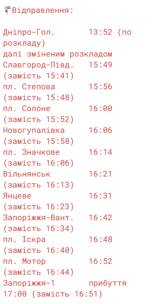 - Із Запоріжжя-1: відправлення о 19:20, прибуття до Дніпра о 21:45. Час у дорозі — 2 год. 25 хв.