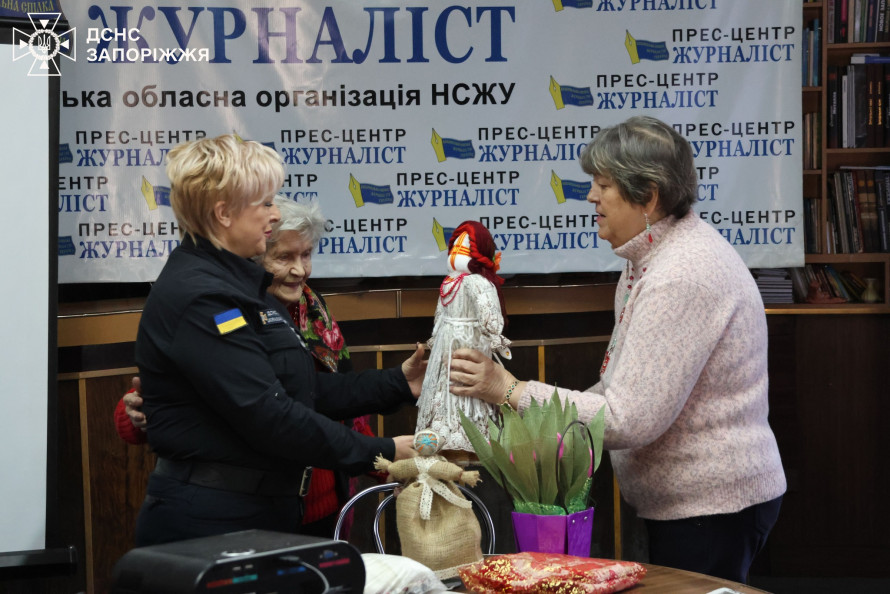 На завершення зустрічі представники Спілки журналістів і ДСНС привітали пані Раїсу з Різдвом і Новим роком та подарували їй ляльку-мотанку — символ захисту й відродження для жінки, яка стала живим уособленням незламності запоріжців.