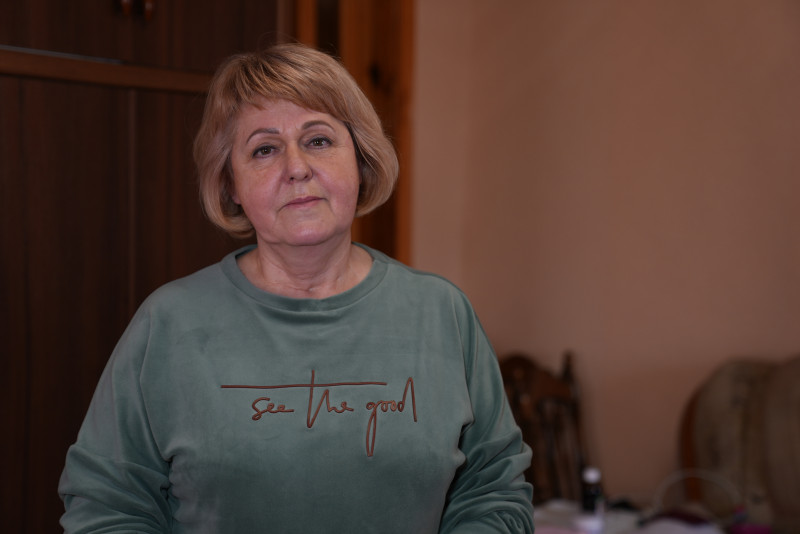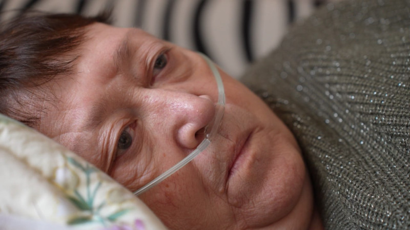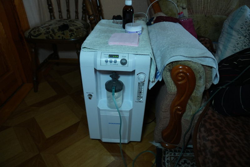 Поруч із кисневим концентратором облаштувала своє спальне місце 67-річна Ірина Хлєбнікова. У неї діагностували хронічне обструктивне захворювання легень: