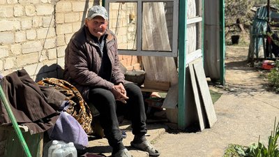 Батько Лариси сидить на ґанку пошкодженого авіаударом будинку в Комишувасі. Суспільне Запоріжжя
