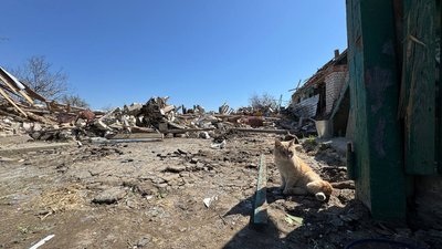 Котик сидить поряд з руїнами внаслідок російського авіаудару по Комишувасі Запорізької області 23 квітня 2026 року. Суспільне Запоріжжя